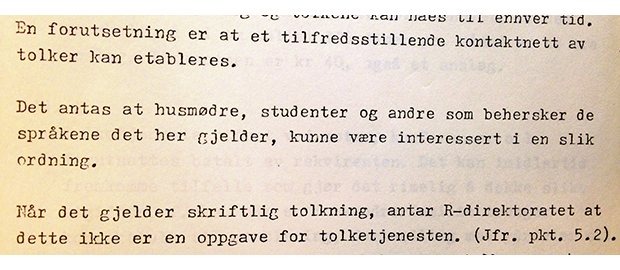 1974: Rasjonaliseringsdirektoratet fikk i 1974 i oppgave å utrede behovet for en offentlig tolketjeneste nærmere og å komme med forslag til organisering.50 Direktoratet slo fast at det offentlige hadde et ansvar for å avhjelpe situasjonen og foreslo opprettelsen av en telefontolketjeneste ved fylkesarbeidskontoret for Oslo og Akershus som en forsøksordning. Direktoratet mente at det vil være mulig å skaffe tolk på de aktuelle språkene: [h]vis det ikke stilles for strenge krav og antok at husmødre, studenter og andre som behersker de språkene det her gjelder, kunne være interessert i en slik ordning.