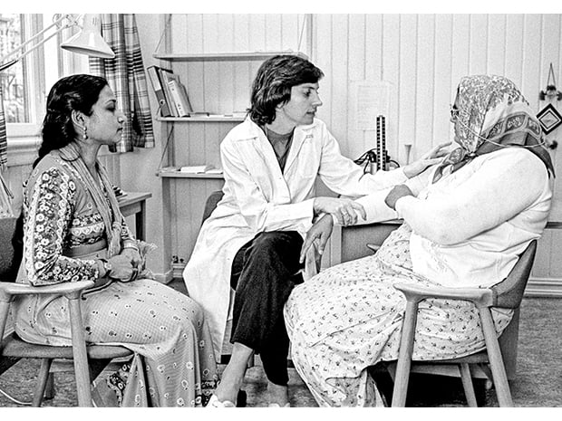 Figur 3.3 Lege undersøker innvandrerkvinne på legekontor i bydelen Sagene, Oslo. Datteren som tolk til stede (1970-tallet)