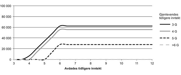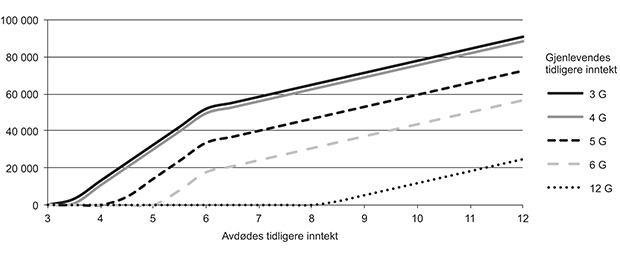 Gjenlevendefordelen øker mest opp til 6 G, men fortsetter å øke helt til avdødes tidligere inntekt er 12 G. Den høyeste fordelen som er mulig med dagens regler er i underkant av 100 000 kroner, og gis hvis gjenlevende har hatt en tidligere inntekt som gir en uførepensjon på minstenivå, 170 000 kroner (2 G), og avdøde tidligere hadde en inntekt på vel en million (12 G).