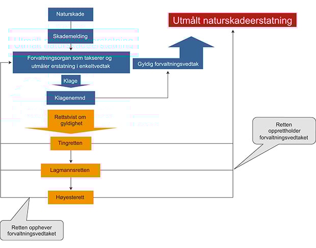 Naturskadeloven regulerer behandling av søknader om naturskadeerstatning i to ulike spor. Som hovedregel skjer det først en rettslig prosess etter skjønnsprosessloven som starter med lensmannsskjønn, deretter en forvaltningsbehandling med endelig vedtak om erstatning. Se kapittel 3.2 for nærmere omtale av saksgangen etter dagens lov.