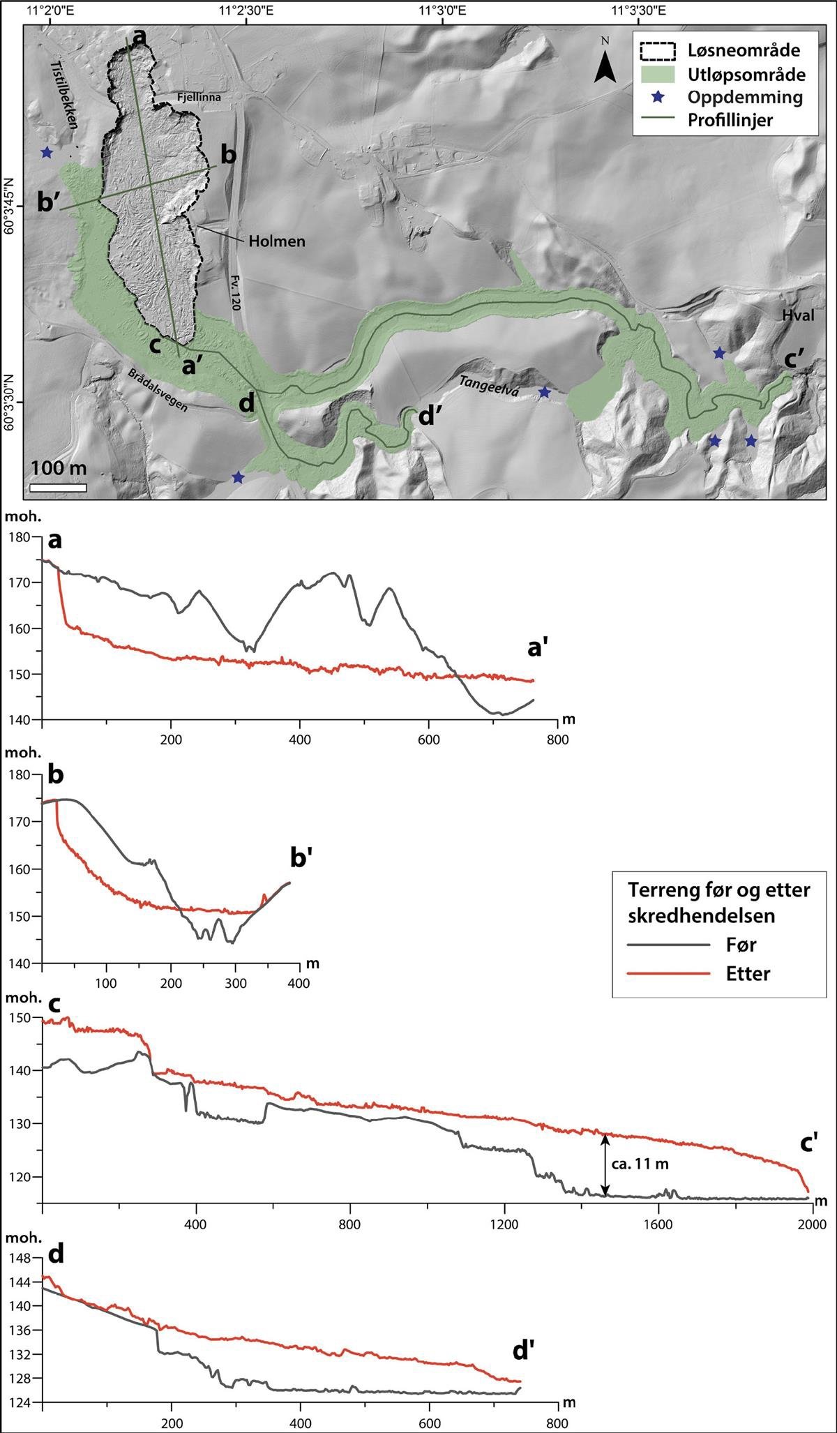 Figur 4.3 Oversikt over skredets løsneområde og utløpsområde, samt profiler fra disse (laget av NGU).