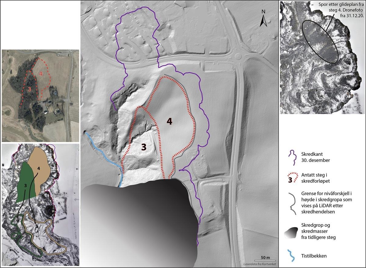 Tolkning av bl.a. flyfoto, dronefoto, videoer, høydemodell fra LiDAR-data og vitneobservasjoner har gitt grunnlag for å vurdere stegene i skredforløpet 30. desember 2020. Antatt omfang av stegene er tegnet inn på figurene. Figur 4.4 viser en samlet oversikt over stegene, og hvert steg er beskrevet i det følgende.