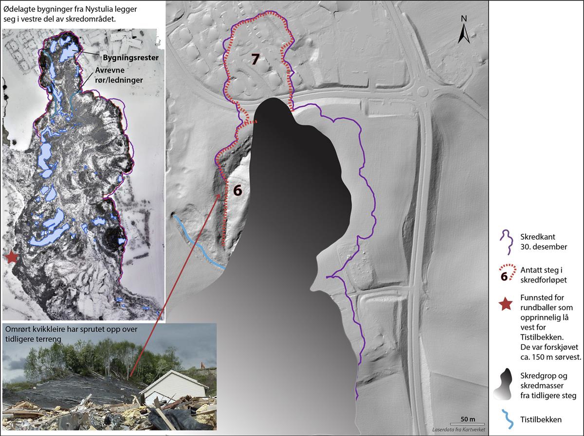 Et av de siste stegene i skredhendelsen var Nystulia (steg 7), og dette området raste ut svært kort tid etter steg 5 og 6 (Figur 4.9). Skredmassene og ødelagte bygninger fra Nystulia la seg langs den vestre siden av skredområdet. Vitner som kom kjørende ned Fjellinna fra øst mot vest måtte bråstoppe foran skredkanten. De observerte at hus fra Nystulia seilte forbi. Under ett minutt etter at vitnene så skredet ringte de til politiet. Dette var den første nødmeldingen politiet fikk fra skredområdet og den kom inn kl. 03:59.