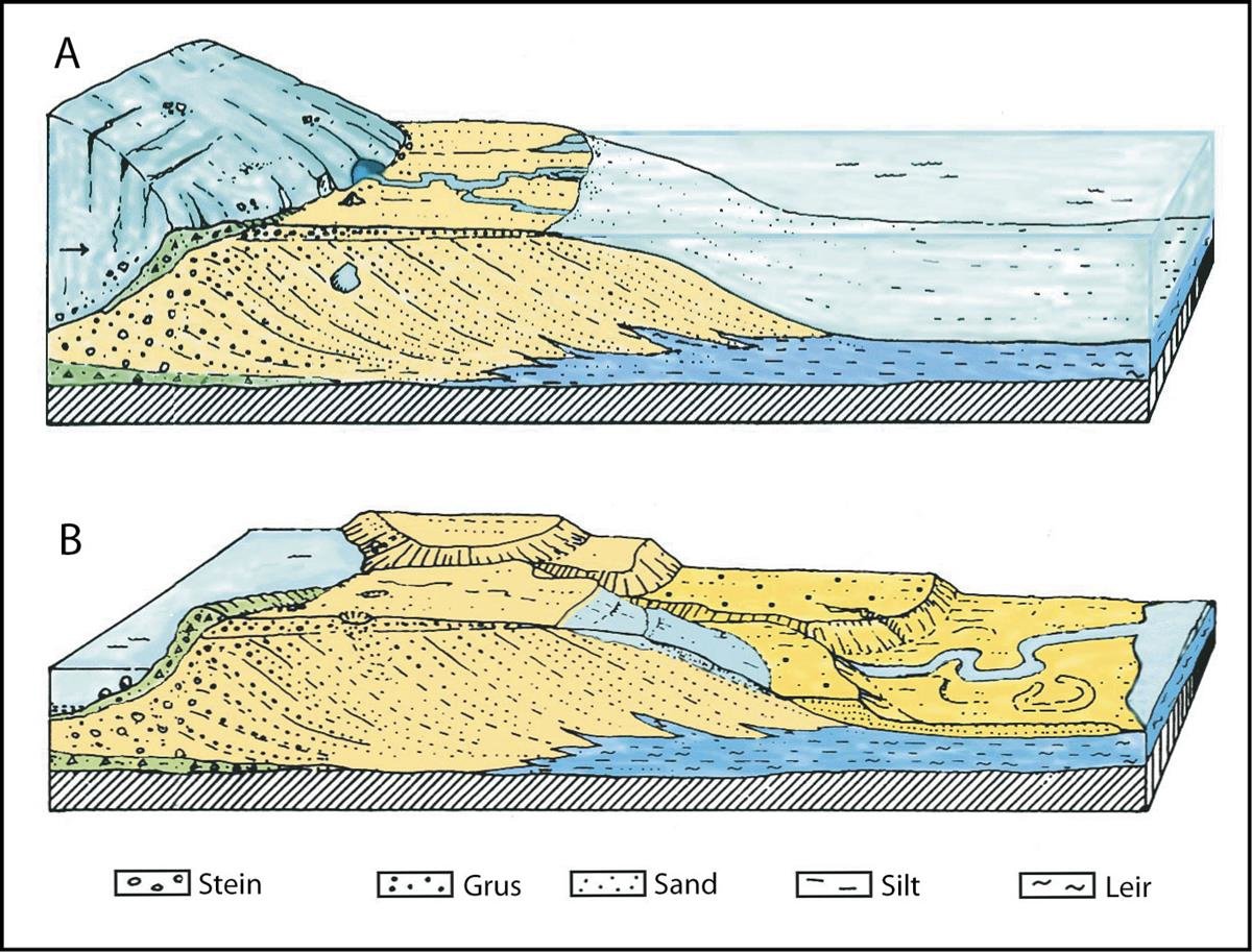 Smeltevannet fra breen fraktet med seg store mengder grove og fine løsmasser. Stein, grus og sand ble avsatt i havet like foran brekanten, og dannet breelvavsetninger. Silt og leir, som er lette partikler, ble fraktet med strømmen og avsatt på sjøbunnen lenger fra breen (Figur 5.1). Materialet i en breelvavsetning er ofte lagdelt, og det er vanlig å finne skrålag som viser hvilken retning massene ble avsatt. Der isen lå i ro over lengre tid, kunne det dannes svært store deltaavsetninger, noen steder med en sandur på toppen.
