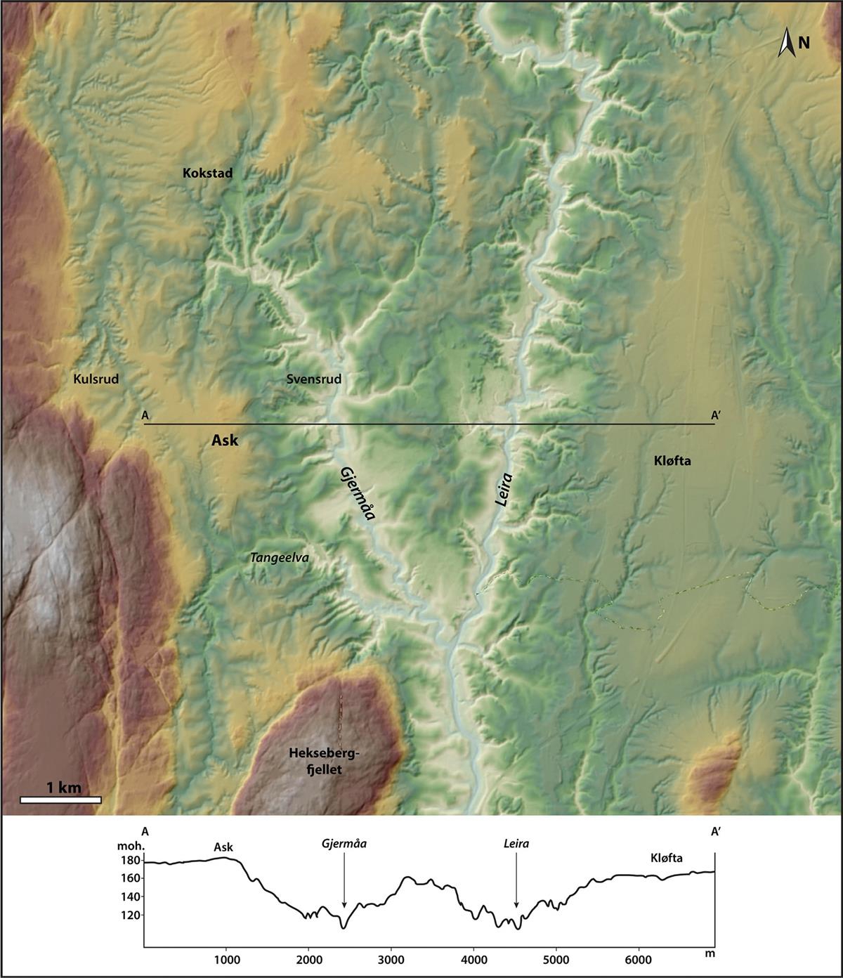 Figur 5.4 Terrenget på Romerike er gjennomskåret av raviner og skredgroper. Sidebekker og raviner bruker elvene Leira og Gjermåa, samt enkelte fjellterskler, som erosjonsbasis. Høydedata fra (Kartverket, 2021).