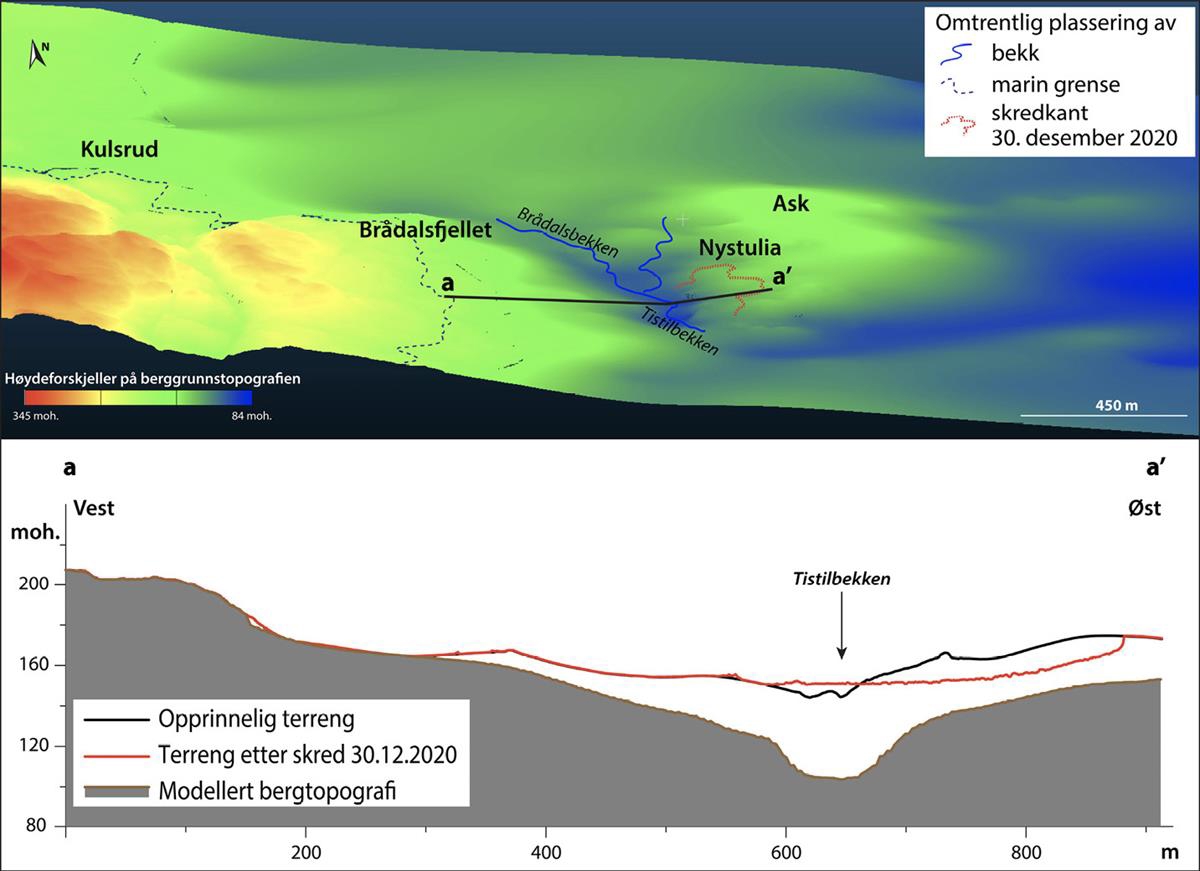 Figur 5.5 NGUs Cloud Compare-modell som viser bergoverflaten under løsmassene for området rundt Ask (se områdelokasjon i Figur 5.3). Profil a-a’ krysser skredgropa. Se (Penna & Solberg, 2021) for dokumentasjon og usikkerheter rundt modellen.