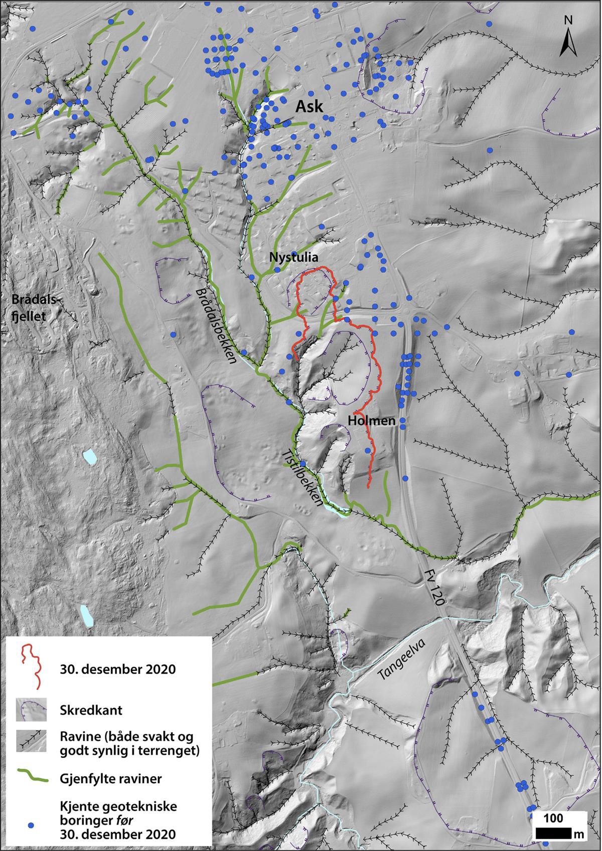 Figur 5.7 Raviner og skredkanter i Ask-området kartlagt av NGU basert på terrengmodeller distribuert av (Kartverket, 2021). Landformene samt kjente geotekniske boringer fra før skredet 30. desember 2020 er vist. Tidligere raviner og bekkeløp som er lagt i rør og/eller bakkeplanert er markert. Disse er kartlagt ved hjelp av flyfoto fra ulike år.