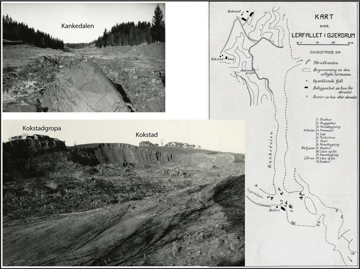 Figur 5.9 Kart og foto over skredet ved Kokstad i 1924. Skredkantene mot Kokstadgårdene var bratte. Skredmassene fylte Kankedalen. Modifisert fra (Holmsen, 1929)