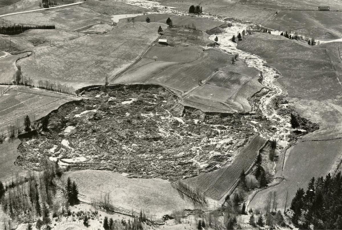 Figur 5.10 Skredet ved Borgen i Ullensaker i desember 1953. Den tilnærmede sirkelformede skredgropa hadde smal skredport som den omrørte kvikkleira rant ut gjennom. Leira fulgte bekkeløpet og demmet opp flere bekker. Foto: Fjellanger Widerøe.