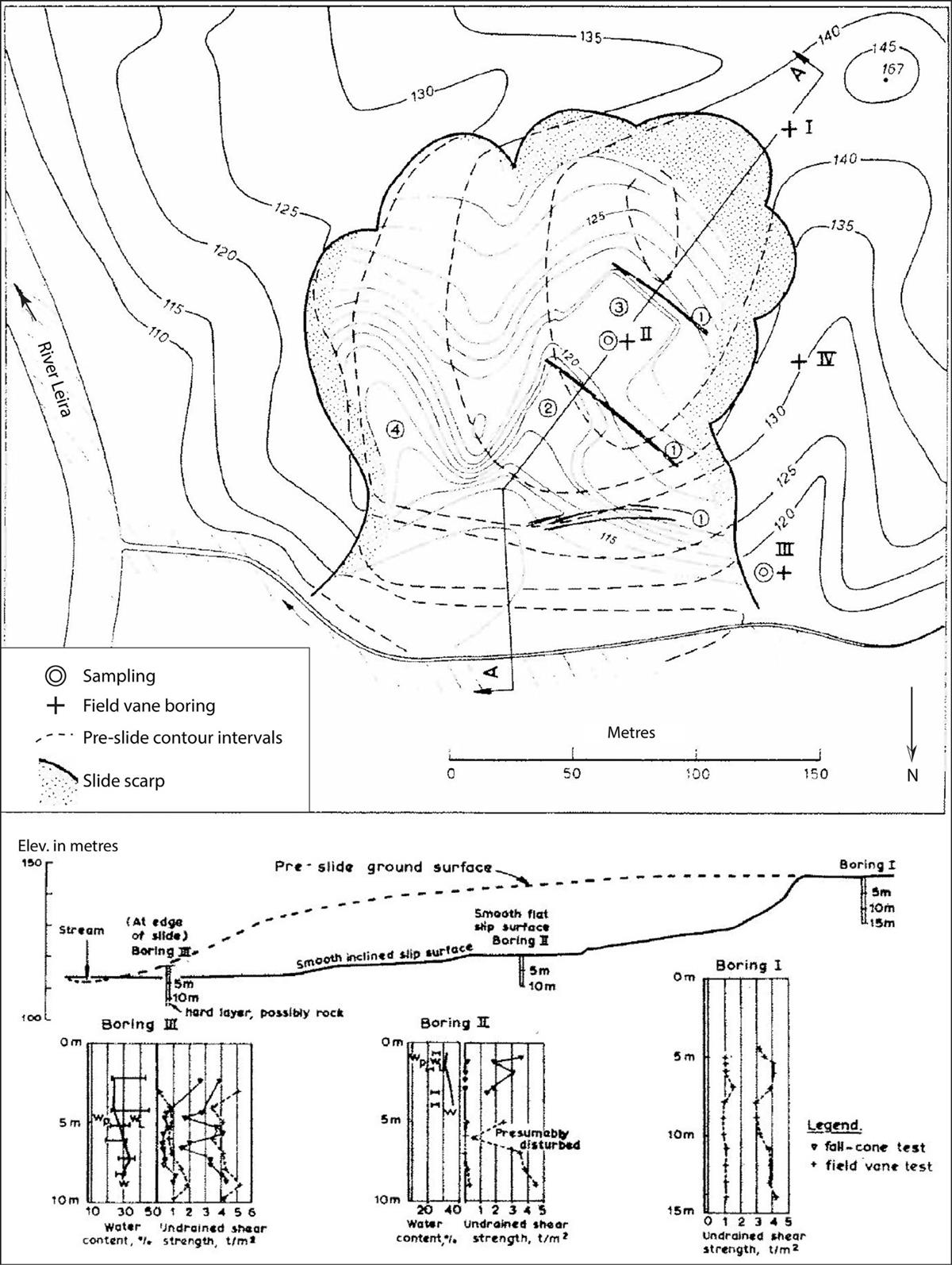 Terrenghelningen der skredet gikk var i gjennomsnitt på 4 prosent. Vingeboringer utført etter skredhendelsen viste at under 2-4 meter fast, omrørt skredleire var det bløt, siltig leire (Rosenqvist, 1960). Utenfor skredgropa var tørrskorpelaget ca. 5 meter tykt. Boringene viste at det var mer kvikkleire på dypet, men nivået til glideplanet lå trolig noen få meter under bekkenivået.