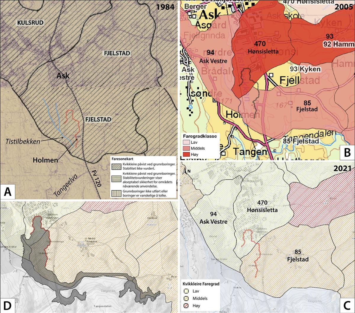 Figur 5.12 A-C: Faresonene i Ask-området har blitt endret både mht. areal og faregrad etter 1984 (NGI 1984; NGI 2005; NVE 2021b). Lenker til faktaark for sonene slik de vises i dag er i vedlegg 3. Bakkanten til løsneområdet er tegnet inn på farekartene. D: Faresonene i Ask-området med løsne- og utløpsområde for skredet 30. desember 2020. Kilde NVE.