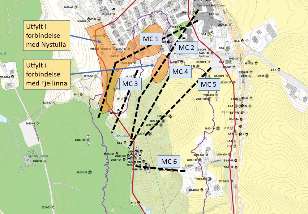 Det er nesten ikke gjort geotekniske grunnundersøkelser i det området som ble berørt av skredet 30. desember 2020 (Figur 5.7). Mobiliteten til skredmassene som rant 2 km gjennom et ravinert område, og hvordan skredmassene la seg nokså flatt i bunnen av skredgropa, tilsier at mye av leira må ha vært kvikk. Grunnundersøkelsene fra før skredet ga ikke klare indikasjoner på dette. Grunneier har påpekt at dyrkingsjorda nord for Holmen var svært hard og lite sensitiv leire. Denne la seg som store flak av tørrskorpe i sørdelen av skredgropa.