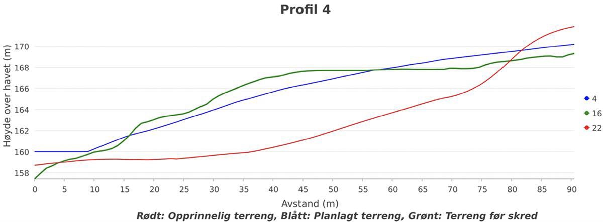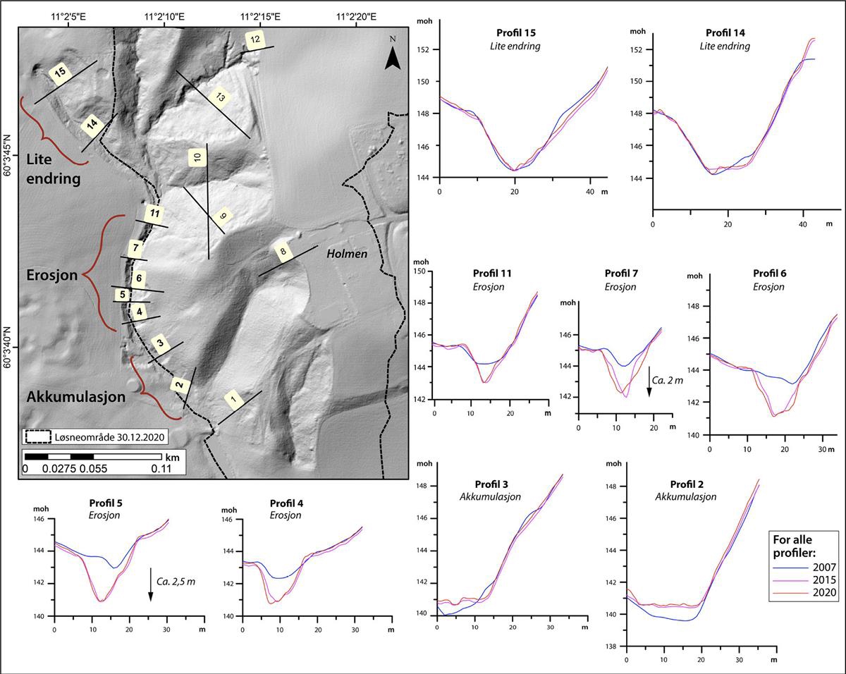Det er også laget tverrprofiler i området, blant annet i Tistilbekken nedstrøms kulverten (Figur 5.36). Profilene viser nokså lite endring rett nedstrøms kulverten, mens nedstrøms sammenløpet av flere raviner er det opptil ca. 2,5 meter erosjon (nedskjæring). Rett oppstrøms dammen er det i hovedsak akkumulasjon (avsetning) av løsmasser. Også i noen av sideravinene er det tydelig tegn på erosjon. Oppstrøms kulverten er det stedvis stor endring i tverrprofilene, som i hovedsak skyldes endringer av bekkeløp som ble gjort i forbindelse med utbygging. Nedskjæringen i deler av Tistilbekken utmerker seg. For flere profiler, se (Penna & Solberg, 2021). Noe erosjon pågikk også før 2007, men 2007 er det eldste LiDAR-datasettet som finnes for området, og er derfor året analysene må ta utgangspunkt i.