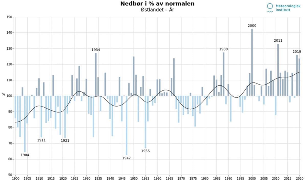 Figur 5.28 Årsnedbør 1900-2020 i prosent av normalen for Østlandet (NVE, 2021).