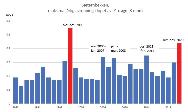 Figur 5.31 Maksimal gjennomsnittlig avrenning ved Sæternbekken målestasjon i løpet av en 3-månedersperiode for årene 1990 – 2020 (NVE, 2021).