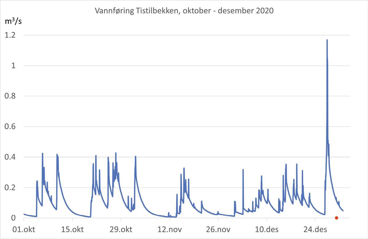 Simuleringene sammenholdt med observasjoner fra nærliggende målestasjoner understøtter etter utvalgets vurdering at det var en rekke episoder med høy vannføring opp til årsmiddelflom i Tistilbekken høsten 2020. Den høyeste vannføringen oppstod 27. desember og var på nivå omkring en årsmiddelflom, jf. Figur 5.32.