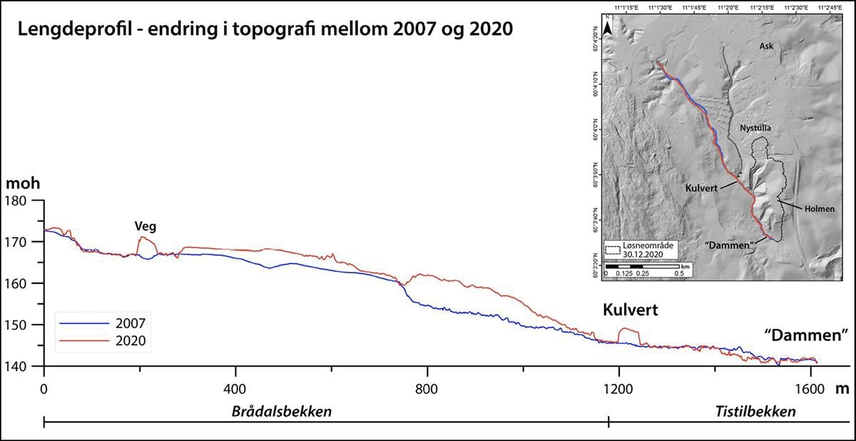 Figur 5.34 Endringer i lengdeprofil (terrengoverflate) langs Brådalsbekken og Tistilbekken basert på sammenligning av Kartverkets terrengmodeller fra 2007 og 2020 (Penna & Solberg, 2021).
