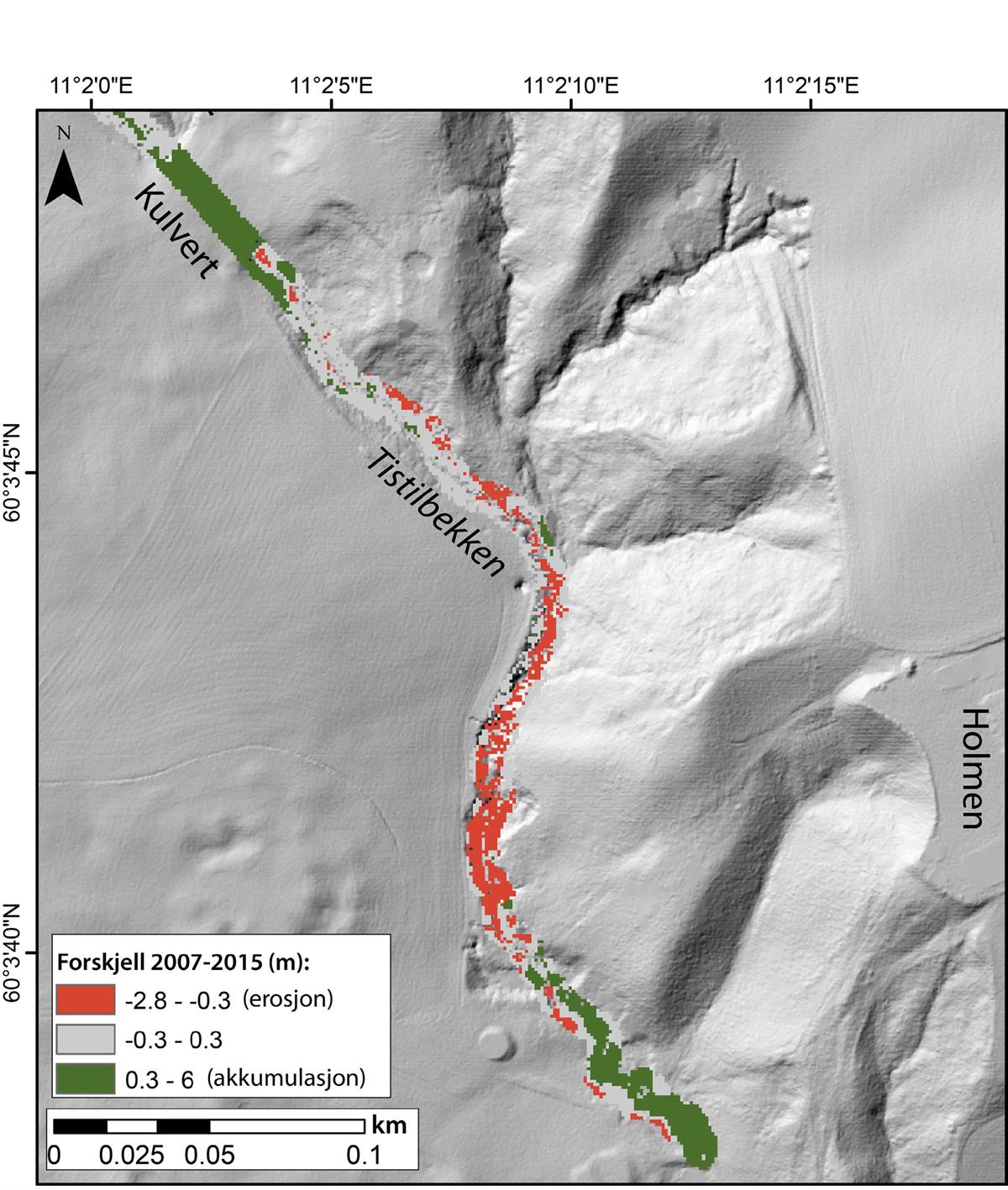 Figur 5.35 Sammenligning av Kartverkets terrengmodeller viser at det mellom 2007 og 2015 var erosjon i deler av Tistilbekken nedstrøms kulverten (Penna & Solberg, 2021).