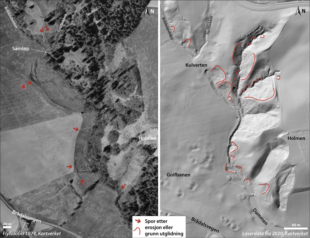 Høydemodeller fra laserdata er nyttige for å vise terrengendringene, og selv små utglidninger i bekke- og ravineskråningene er synlige. Det er likevel begrenset hvor langt tilbake man har slike data, og for tidligere terrengformer og utvikling av områder er flyfoto (vertikalfoto) også av stor verdi. Figur 5.37 viser eksempel på spor etter utglidninger langs Tistilbekken og sideraviner. Slike utglidninger er vanlige i små og store vassdrag og skråninger, og en naturlig del av landskapsutviklingen. De dannes som følge av ulike typer erosjon som undergraving i bekk, overflateerosjon, grunnvannserosjon o.l. Erosjonen kan forsterkes av f.eks. intensiv nedbør/snøsmeltning, fjerning av vegetasjon og menneskeskapte terrengendringer. Om en grunn utglidning fører til et skred avhenger av bl.a. skråningens høyde og bratthet, og hvilke løsmasser som finnes i bakkant.