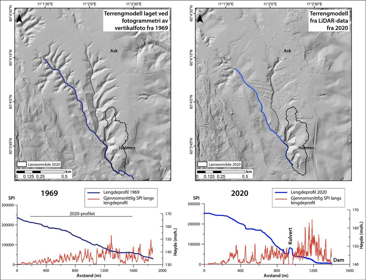 NGU og NVE har beregnet Stream Power Index (SPI) for Brådalsbekken og Tistilbekken. SPI er et mål for den eroderende kraften til strømmende vann, og er en geomorfologisk analyse beregnet ut fra bekkens helning og tilsigsområde. For en bekk med helt jevn helning vil SPI øke nedstrøms fordi tilsigsområdet øker. Figur 5.39 viser eksempler på SPI beregnet med utgangspunkt i terrengmodeller. Terrenghelningen langs bekken er endret mellom 1969 og 2020. 1969 var før bakkeplanering og utfylling og profilet viser et nokså jevnt hellende bekkeløp. SPI har topper der helningen øker lokalt. Dette gjelder også for 2020-datasettet, men siden terrenget her er endret, med flere knekkpunkter og stedvis brattere, er det kraftigere respons i SPI. Nedstrøms kulverten er SPI for 2020 størst i den delen der det er dokumentert mest erosjon, og SPI minker etter hvert som bekken flater ut mot dammen. Terrengmodellen fra 1969 er basert på fotogrammetri og er derfor mindre detaljert enn terrengmodellen fra 2020 som er basert på et detaljert Lidar-datasett. Derfor er det trenden i SPI som må sammenlignes. Se Penna & Solberg (2021) for profiler fra flere år og dokumentasjon av beregningene.
