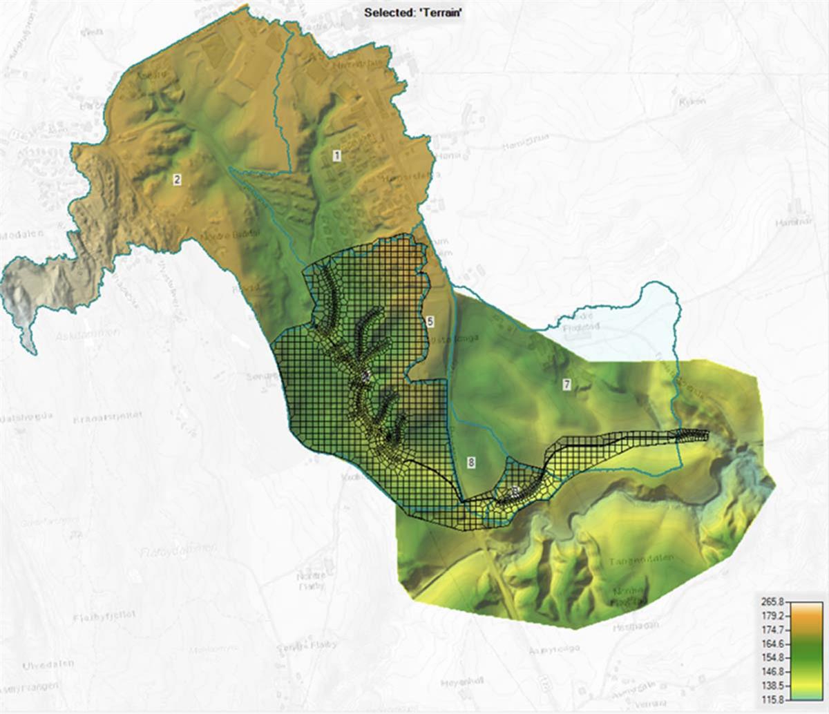Figur 5.40 Modellområde for hydraulisk simulering markert med raster over terrengmodell (modell utarbeidet av Sweco).
