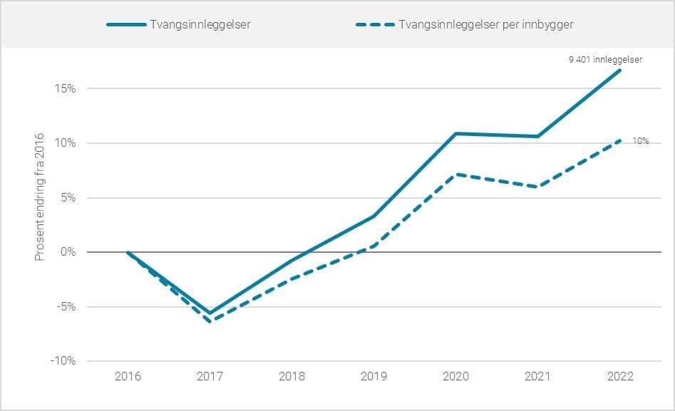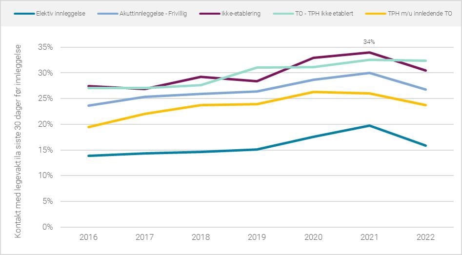 Også henvisende lege skal, fra 2017, ta stilling til vilkåret om manglende samtykkekompetanse. Terskel for henvisning til tvungent vern kan derfor tenkes å være påvirket av lovendringene. Det totale antallet av henvisninger til tvungen observasjon og tvungent psykisk helsevern kan ikke avledes sikkert fra registerdata, men den gjennomgangen som er gjort av rapporterte data for perioden 2016–2022 gir ikke grunnlag for å anta en reduksjon i slike henvisninger i perioden. Anslagsvis har det derimot vært en økning på 610 prosent, altså om lag eller noe mer enn det som kan forventes fra befolkningsveksten. Samtidig viser legevaktsdata rapportert til KPR at en økende andel av de pasientene som legges inn i psykisk helsevern hadde hatt én eller flere kontakter med legevakt siste 30 dager før de ble innlagt, men som ikke resulterte i innleggelse i psykisk helsevern, se fremstilling i figur 6.8.