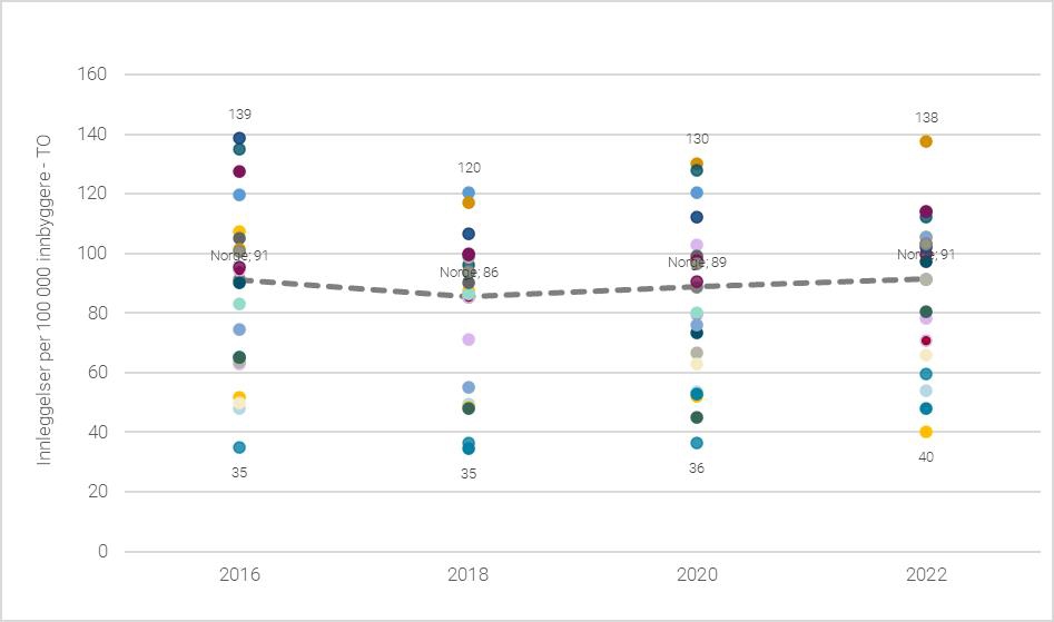 Note: Punktene representerer innleggelsesraten i opptaksområdene for de ulike helseforetakene. Ratene er korrigert for gjestepasienter.