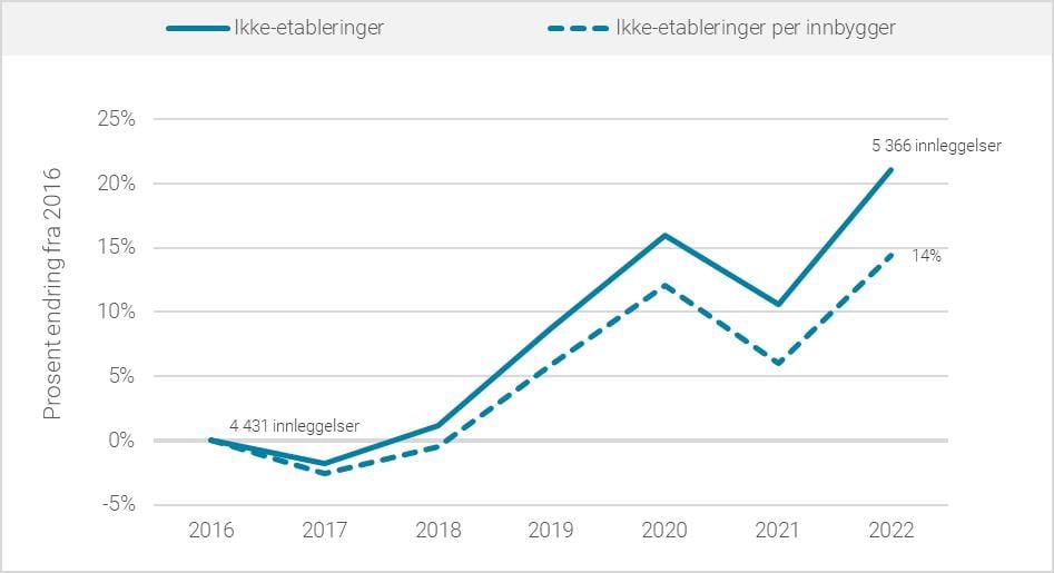 Figur 6.10 Ikke-etableringer i psykisk helsevern i perioden 2016 – 2022.