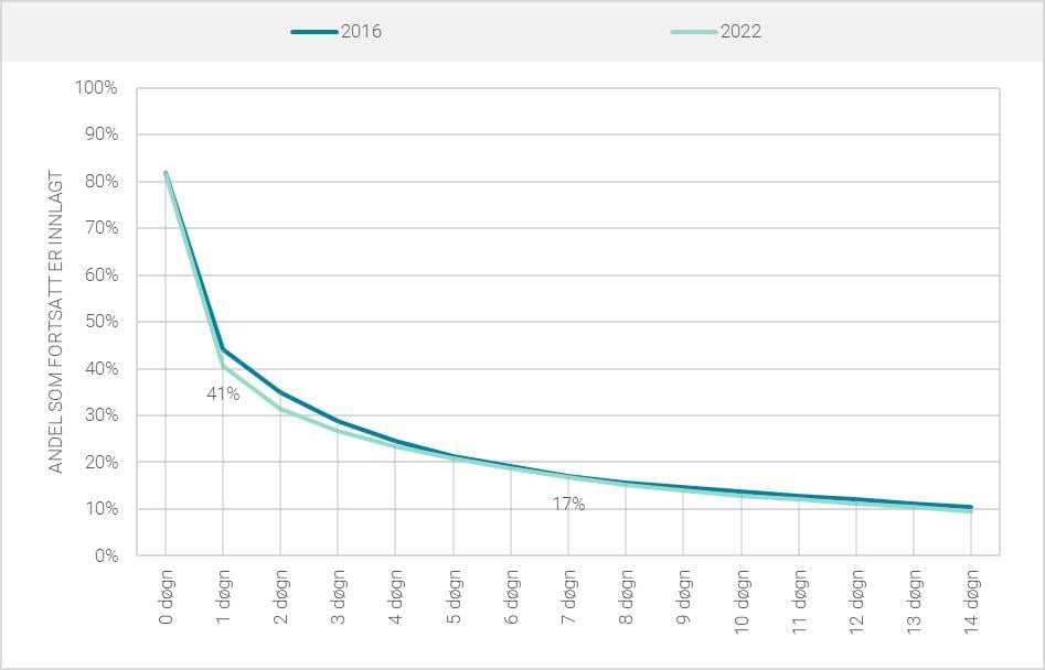 Figur 6.11 Fordeling av varighet for døgnopphold i psykisk helsevern ved vedtak om ikke-etablering av tvungent vern. Gjelder opphold som ble avsluttet i henholdsvis 2016 og 2022.