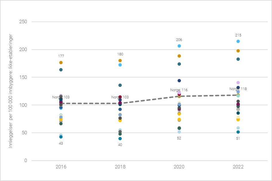 Figur 6.12 Innleggelsesrate for ikke-etableringer i perioden 2016 – 2022.