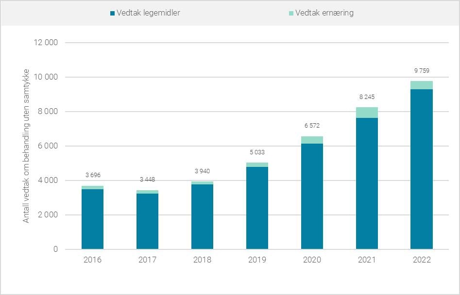 Figurene 6.13 og 6.14 viser at det i 2022 ble rapportert nærmere 10 000 vedtak om behandling uten eget samtykke, fordelt på 3 750 pasienter. Antall vedtak er med det nesten tredoblet fra 2016, mens pasientraten har økt 80 prosent. De fleste vedtakene gjelder medisinering, men det rapporteres også et økende antall vedtak om tvungen ernæring.