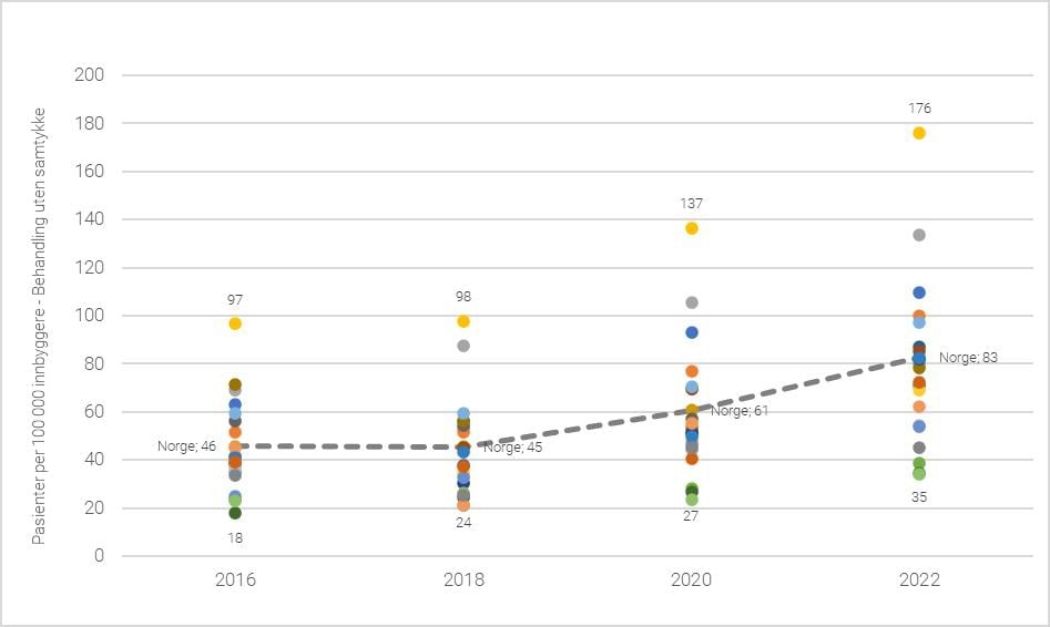 Som omtalt over, observeres det på nasjonalt nivå 14 prosent økning i innleggelsesraten for ikke-etableringer. Samtidig viser registerdata, som illustrert i figur 6.12, at utviklingen varierer mellom helseforetakene. Økningen gjenfinnes i noe over halvparten av helseforetaksområdene, og de geografiske forskjellene har økt betydelig fra 2016 til 2022. Utvalgets vurdering er at de økte forskjellene understøtter en antagelse om ulik praktisering av samtykkevilkåret. Det bemerkes imidlertid at forskjellene i bruk av tvang var store også før 2017, og at de normerende dokumenter, som helsedirektoratets rundskriv eller rettspraksis, over tid ikke har bidratt vesentlig til å redusere ulikheter i bruk av tvang. Etter utvalget syn, trengs det en mer omfattende og nasjonalt forankret kompetanseheving dersom ulikheter i både vurdering av vilkår for og praktisering av gjennomføring av tvungent psykisk helsevern skal reduseres. Lovendringer alene synes derimot å kunne bidra til økte forskjeller i bruk av tvang.