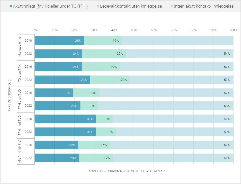 Av alle de pasientene som hadde blitt tatt imot på tvangsparagraf, viser registerdata-analysene at om lag én av fire ble reinnlagt innen 30 dager etter utskrivning. På aggregert nivå er heller ikke denne andelen vesentlig endret fra 2016 til 2022, og det gjelder uavhengig av hvilken av de fire kategoriene av opphold basert på tvang som studeres. En litt høyere andel hadde hatt kontakt med legevakt uten at de ble innlagt i 2022 enn i 2016. Figuren viser videre at sannsynligheten for reinnleggelse var høyere dersom vedtaket om tvungent psykisk helsevern ble videreført som TUD enn i de tilfeller der tvungent psykisk helsevern opphørte før pasienten ble skrevet ut.