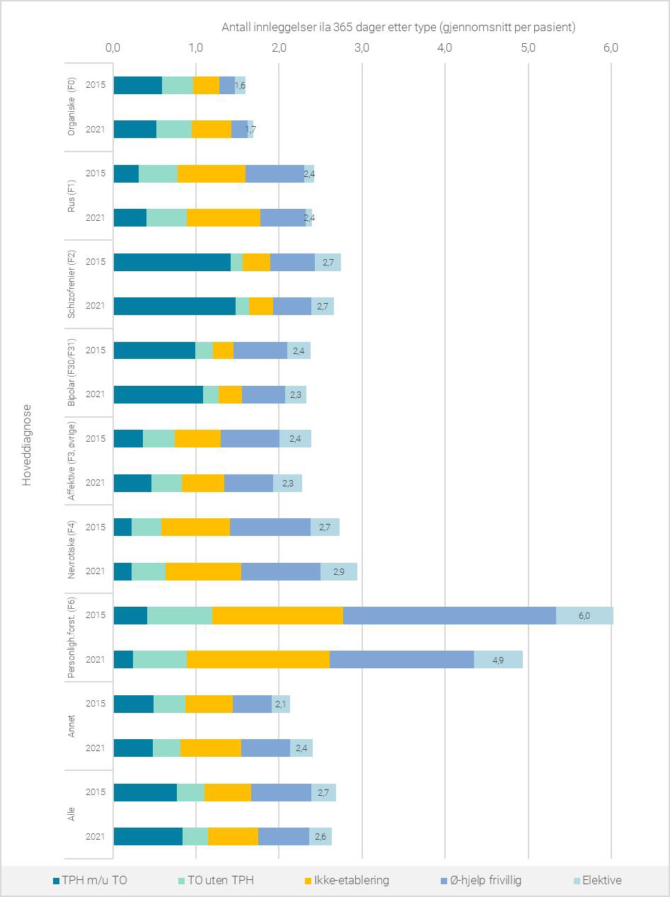 Figur 6.18 viser endring i gjennomsnitt og fordeling av innleggelser for de ulike diagnosegruppene dersom alle typer innleggelser tas i betraktning. Figuren viser at antall innleggelser totalt var redusert fra et gjennomsnitt per pasient på 2,7 i 2015 til 2,6 i 2021, men reduksjonen er knyttet til frivillig døgnbehandling.