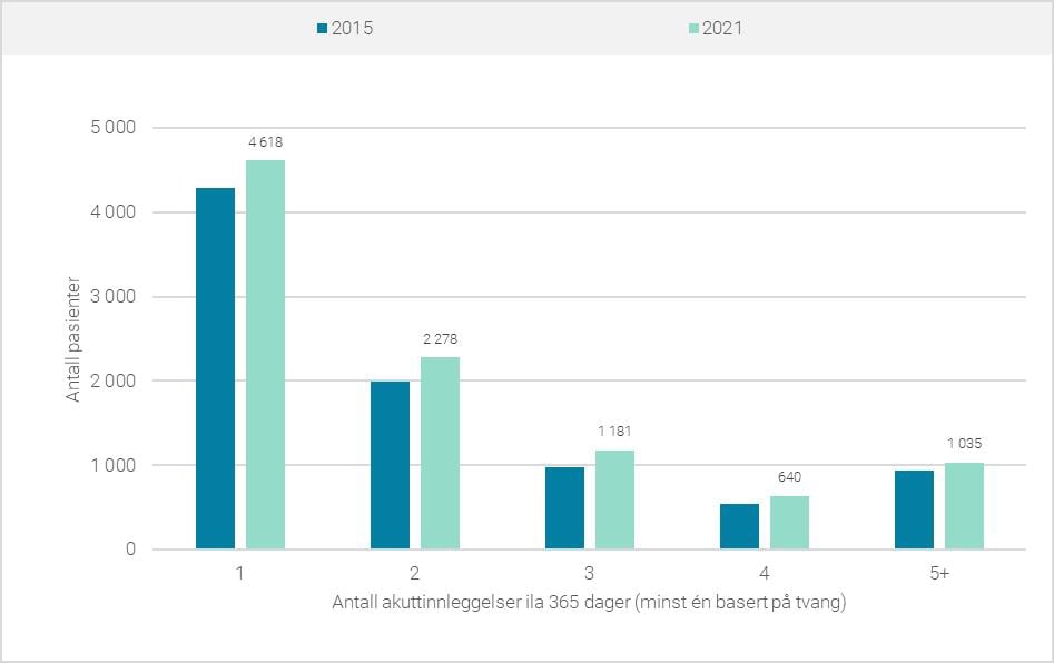 Det er også et økende antall pasienter som erfarer å bli henvist og/eller innlagt under tvungent vern. Figur 6.19 viser at om lag halvparten hadde hatt bare én slik innleggelse ila 365 dager, men det er et økende antall med gjentatte akuttinnleggelser. I 2021 var det 2 865 pasienter i utvalg 2 som hadde tre eller flere akuttinnleggelser innenfor en periode på ett år. Dette var 16 prosent flere enn i 2015 (utvalg 1) og tilsvarer 10 prosent av døgnpasientene i psykisk helsevern. 1 035 pasienter hadde fem eller flere akuttinnleggelser, hvorav minst én var basert på tvang.