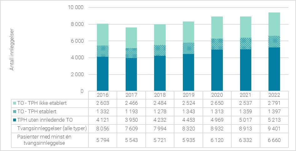 Selv om registerdata ikke gir sikker informasjon om hvor mange som hvert år henvises for innleggelse på tvangsparagraf, vurderes det å være støtte i datagrunnlagene for å fastslå at en høyere andel av slike henvisninger har resultert i en ikke-etablering i årene etter 2017. Det kan altså se ut til at den vurderingen som er gjort av henvisende lege oftere overprøves av faglig ansvarlig i 2022 enn i 2016. Det er utvalgets vurdering at dette peker i retning av noe forhøyet terskel for etablering av tvungent psykisk helsevern de senere årene.
