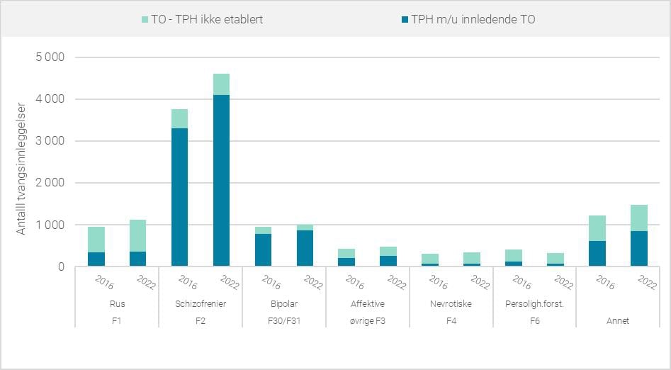 De største økningene i gjennomsnittlig antall tvangsinnleggelser (inkludert ikke-etableringer) per pasient assosieres med organiske lidelser (ICD-10, kap F0), ruslidelser (ICD-10, kap F1) og nevrotiske lidelser (ICD10, kap F4). For alle diagnosegrupper var det også gjennomgående flere innleggelser per pasient i 2021 for pasienter som var identifisert med rus som tilleggsproblematikk.