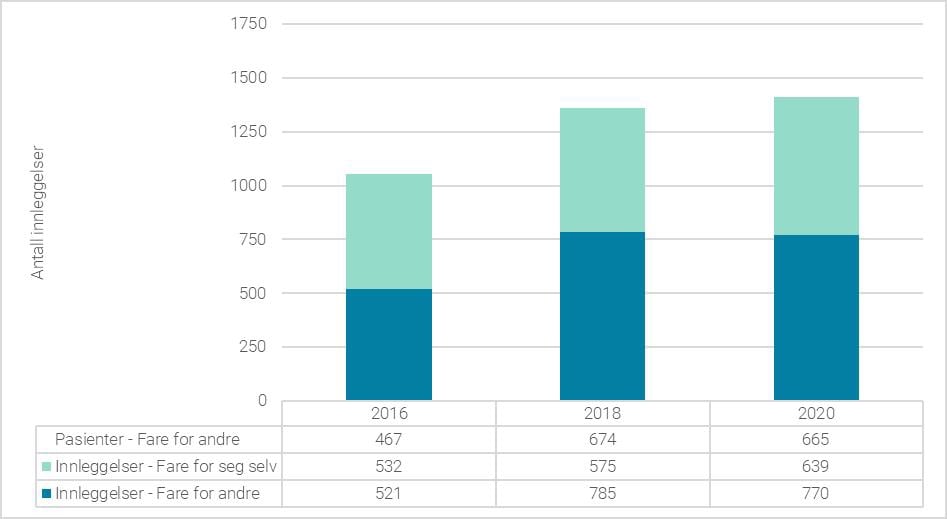 Ved å sammenlikne situasjonen i 2015 og 2021, finner utvalget at gjennomsnittet av antall tvangsinnleggelser per pasient har økt for de fleste diagnosegrupper. Det er også en litt større gruppe med gjentatte akutt- og tvangsinnleggelser. Sannsynligheten for reinnleggelse innen 30 dager etter utskrivelse er ikke vesentlig endret samlet sett, men for pasienter med rusmiddelmisbruk som tilleggsproblematikk, har det blitt flere reinnleggelser. For denne pasientgruppen observeres også redusert varighet av døgnbehandlingen. Utvalget mener at dette er utviklingstrekk som støtter oppunder innspill fra tjenesten om at rusmiddelmisbruk kan være en kompliserende faktor i praktisering av samtykkevilkåret fordi dette er pasienter der samtykkekompetansen kan variere med inntak av rusmidler.