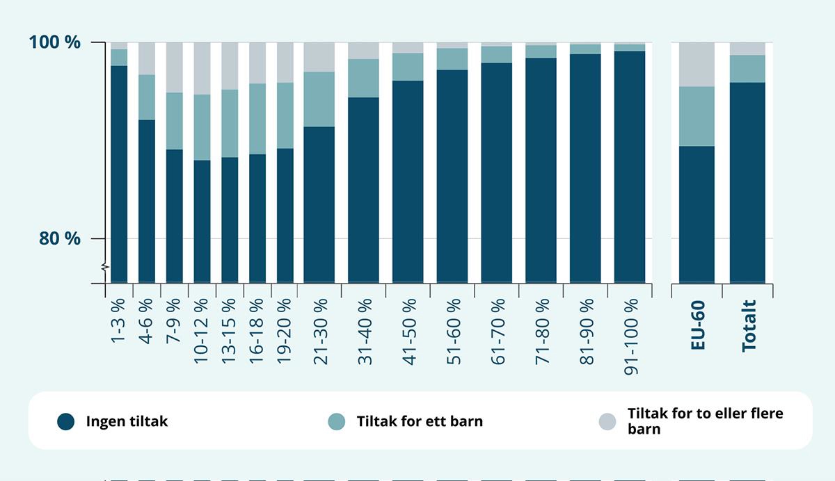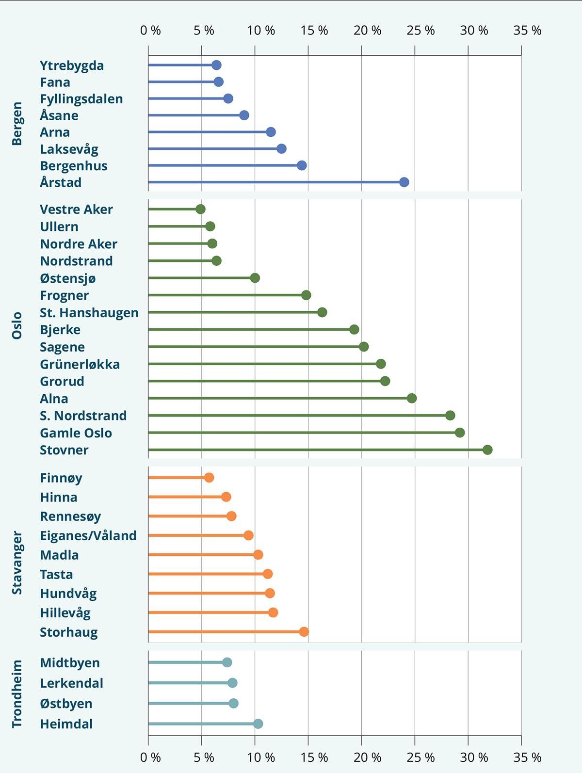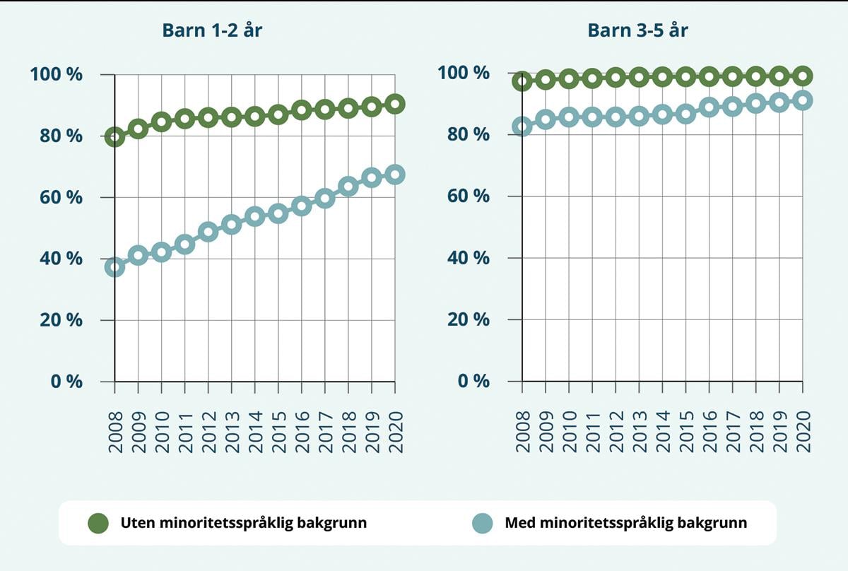 En mindre del av økningen mellom 2004 og 2021 skyldes imidlertid også en økning i hvor stor andel av barn uten innvandrerbakgrunn som er i lavinntektsfamilier. Andelen har økt fra 4,7 prosent i 2004-2006 til 5,6 prosent i 2019-2021.