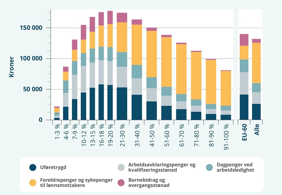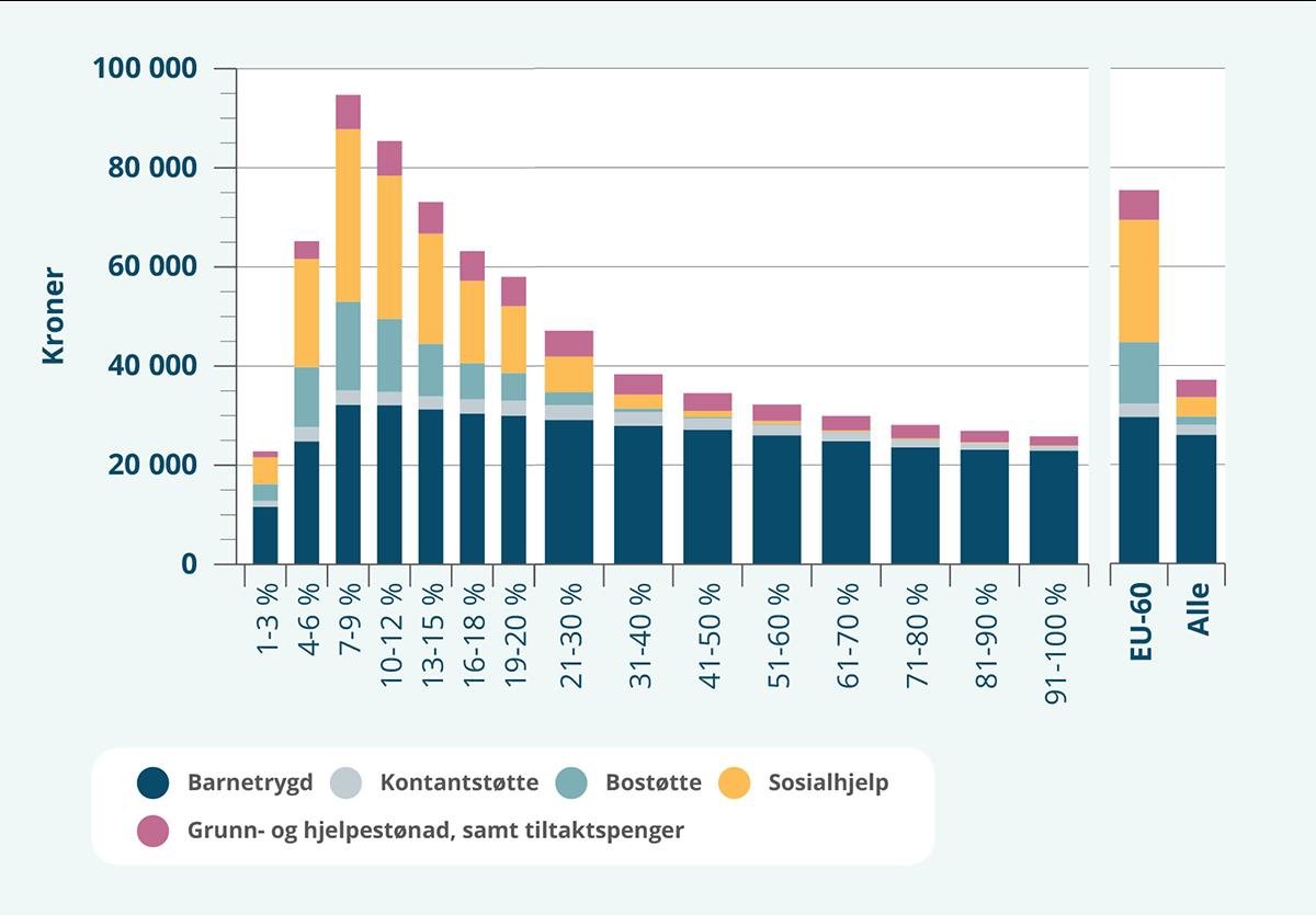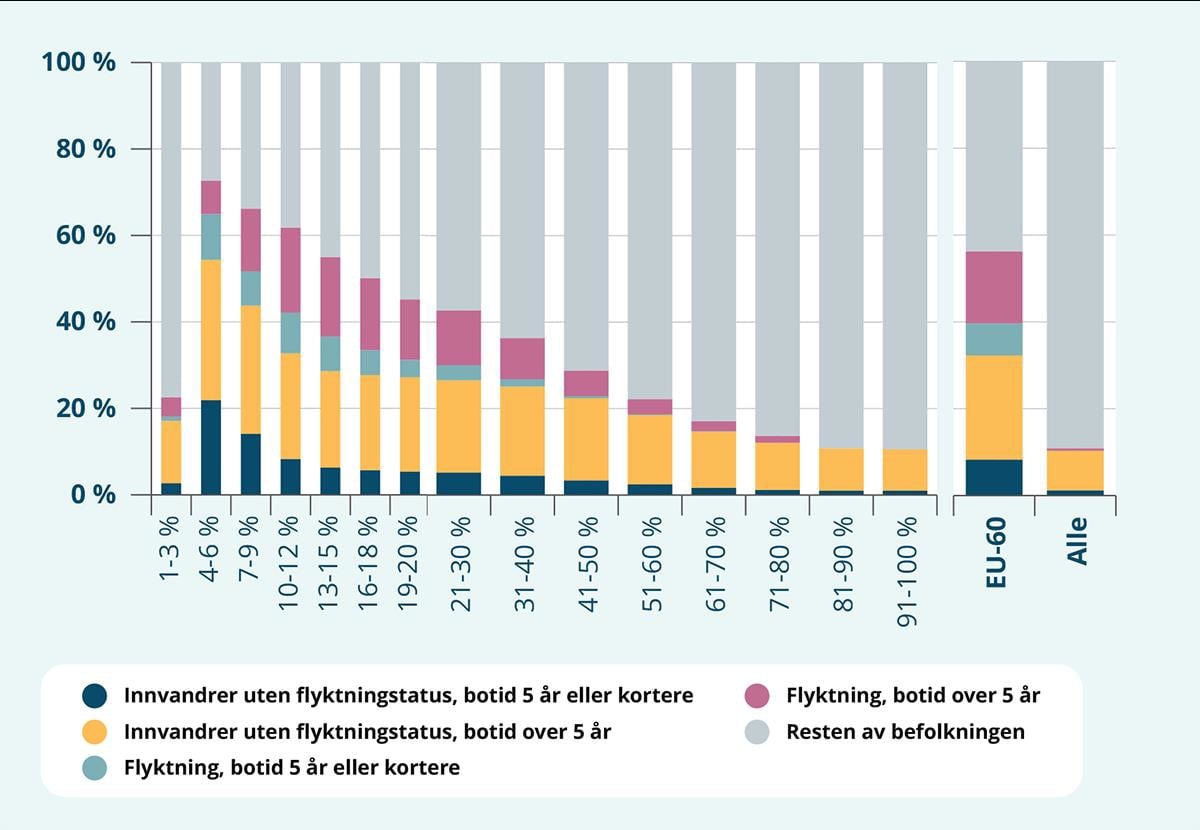 I 3.4.3 viser vi at innvandrere fra land der mange kommer som flyktninger, har en særlig høy andel av lavinntekt. Blant flyktninger er ofte arbeidsmarkedsmulighetene begrenset, spesielt de første årene da voksne plikter å delta i introduksjonsprogram. I tillegg lever personer med flyktningbakgrunn oftere i større husholdninger, og må forsørge flere familiemedlemmer. De første årene etter ankomst mottar mange flyktninger introduksjonsstønad og sosialhjelp. For mange familier vil dette innebære en årlig inntekt under lavinntektsgrensen. Ekspertgruppen vil ikke drøfte nivået på disse overføringene, men vil poengtere at familier med flyktningbakgrunn på den måten automatisk kan havne under lavinntektsgrensen.
