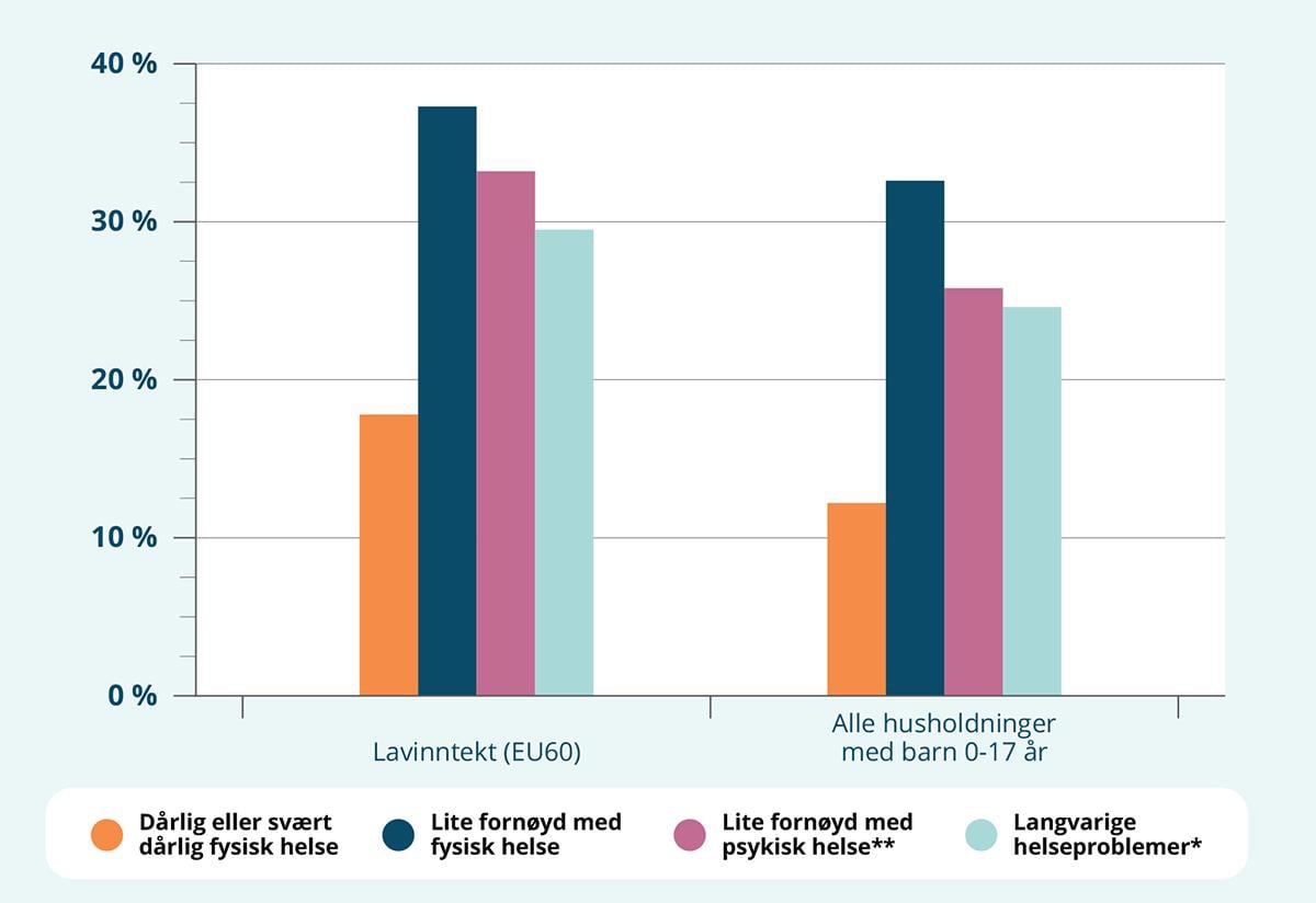 Barn som vokser opp i fattige familier har større risiko enn andre barn for å ha dårligere levekår og livskvalitet. Sammenlignet med andre barn skårer de i gjennomsnitt lavere på indikatorer for fysisk og psykisk helse. Barnehagedeltakelsen er lavere for denne gruppen og de deltar i mindre grad i fritidsaktiviteter. Ungdom med lav sosioøkonomisk status oppgir i større grad å være ensom og mindre tilfreds med livet, sammenlignet med andre sosioøkonomiske grupper.