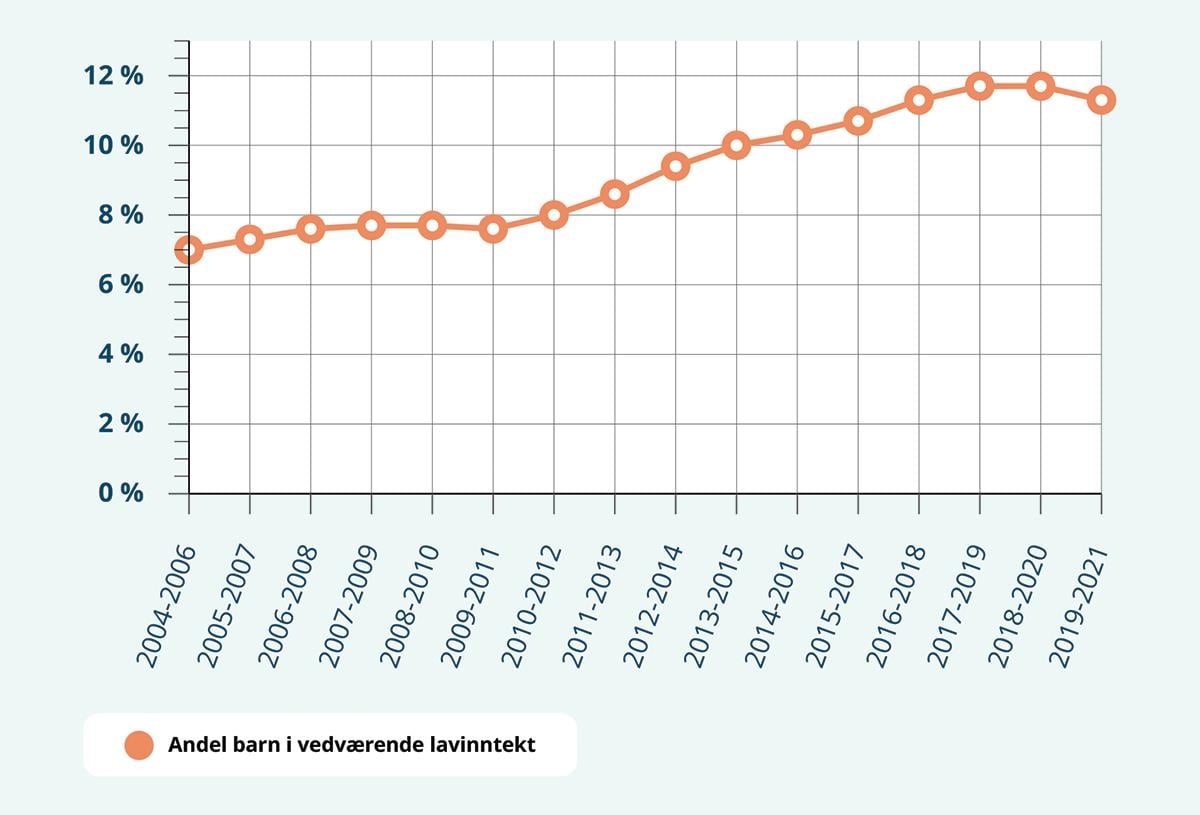 Note: Andel barn i husholdninger med vedvarende lavinntekt. År 2004-2021. Husholdninger definert som lavinntekt dersom de har gjennomsnittlig inntekt etter skatt i en treårsperiode under 60 prosent av median i samme periode. Inntekt justert for antall forbruksenheter i husholdninger (EU-skala). Studenthusholdninger og aleneboende barn under 18 år er ikke inkludert.