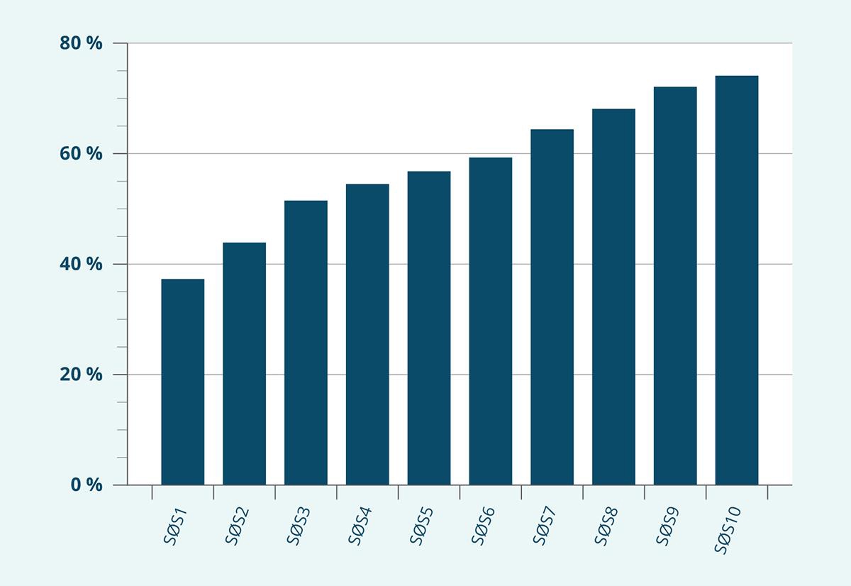 Forskjellene i gjennomføring av videregående er store mellom elever fra familier med lavere eller høyere inntekt. 98 prosent av alle 16-åringer begynner direkte i videregående opplæring, men ikke alle fullfører etter 5 eller 6 år. 20 Figur 3.41 viser andelen som fullførte studie- eller yrkeskompetanse i løpet av 5/6 år. Figuren viser til ulike kohorter der de eldste er født i 1990-1991 og de yngste er født i 1998-1999. Gjennomføringsraten øker med inntekt. Videre har gjennomføringsraten økt de siste årene, og økningen har vært særlig stor nederst i inntektsskalaen, for gruppene som hadde lavest gjennomføringsgrad i utgangspunktet. For kohorten født i 1990-1991 var fullføringsgraden under 60 prosent for den laveste inntektsdesilen, mens for kohorten født i 1998-1999 var det over 70 prosent av disse som fullførte. Gapet til høyeste inntektsdesil er likevel stort, der hele 90 prosent av den yngste kohorten fullførte i løpet av 5/6 år.