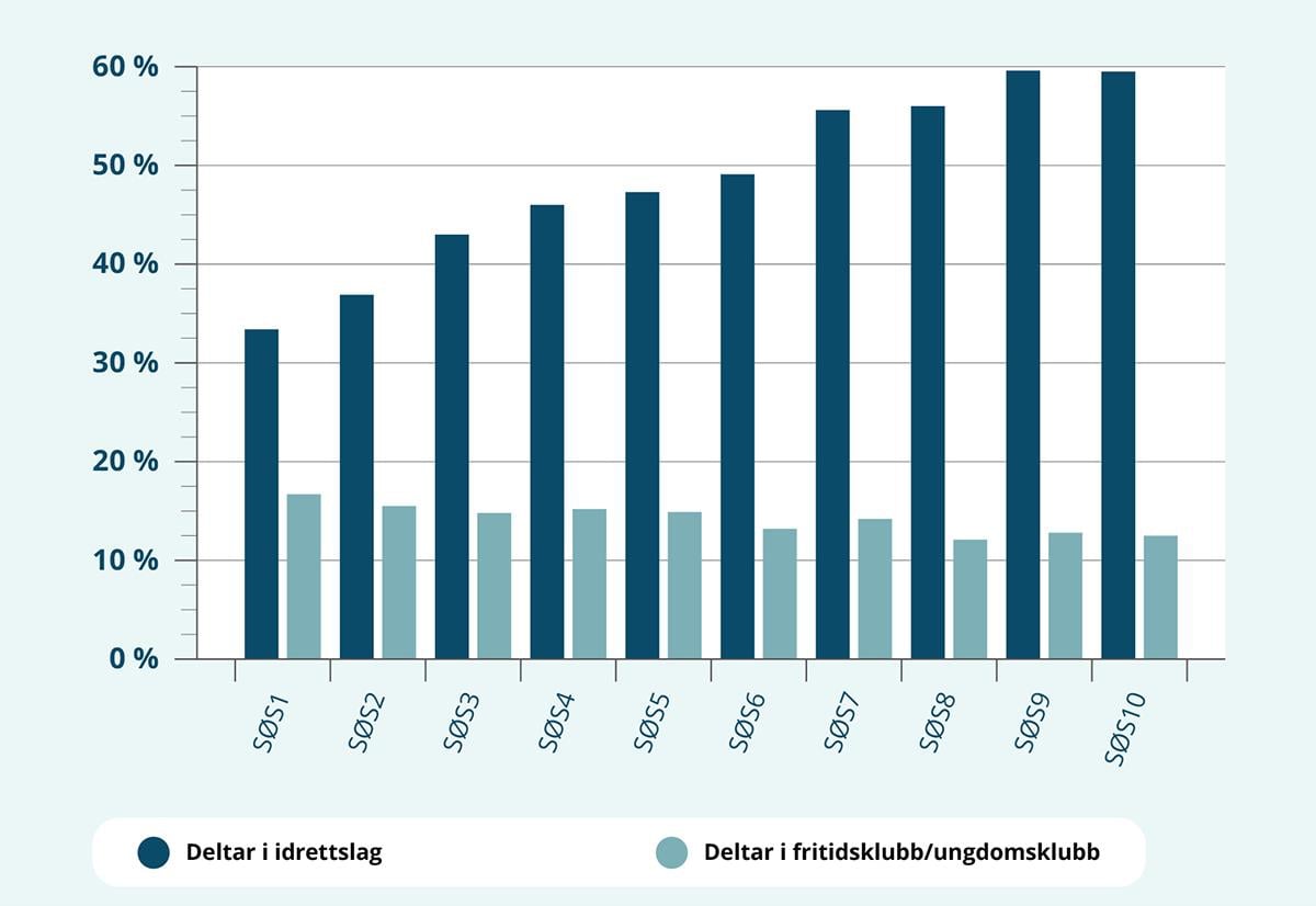 Note: Andel elever i 8.-10. klasse som deltar i idrettslag og fritidsklubb/ungdomshus/ungdomsklubb. År 2022-2023. Deltar i idrettslag er andelen som svarer at de trener eller konkurrerer i et idrettslag 1-2 ganger i uka. Deltar i fritidsklubb er andelen som svarer at de deltok 3-4 ganger eller oftere i fritidsklubb/ungdomshus/ungdomsklubb den siste måneden. SØS1 betegner lavest sosioøkonomisk status og SØS10 betegner høyest sosioøkonomisk status. Sosioøkonomisk status er beregnet ut fra spørsmål om familiens materielle og sosiale ressurser.