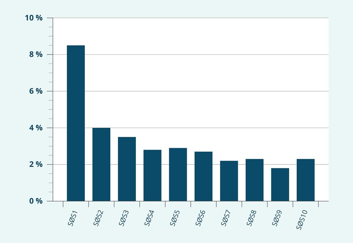 Note: Andel elever i 8.-10. klasse som oppgir at foreldre eller foresatte ofte mangler penger til å betale for fritidsaktiviteter de ønsker å delta i (idrett, kino, bursdager, reiser etc.). År 2022-2023. SØS1 betegner lavest sosioøkonomisk status og SØS10 betegner høyest sosioøkonomisk status. Sosioøkonomisk status er beregnet ut fra spørsmål om familiens materielle og sosiale ressurser.