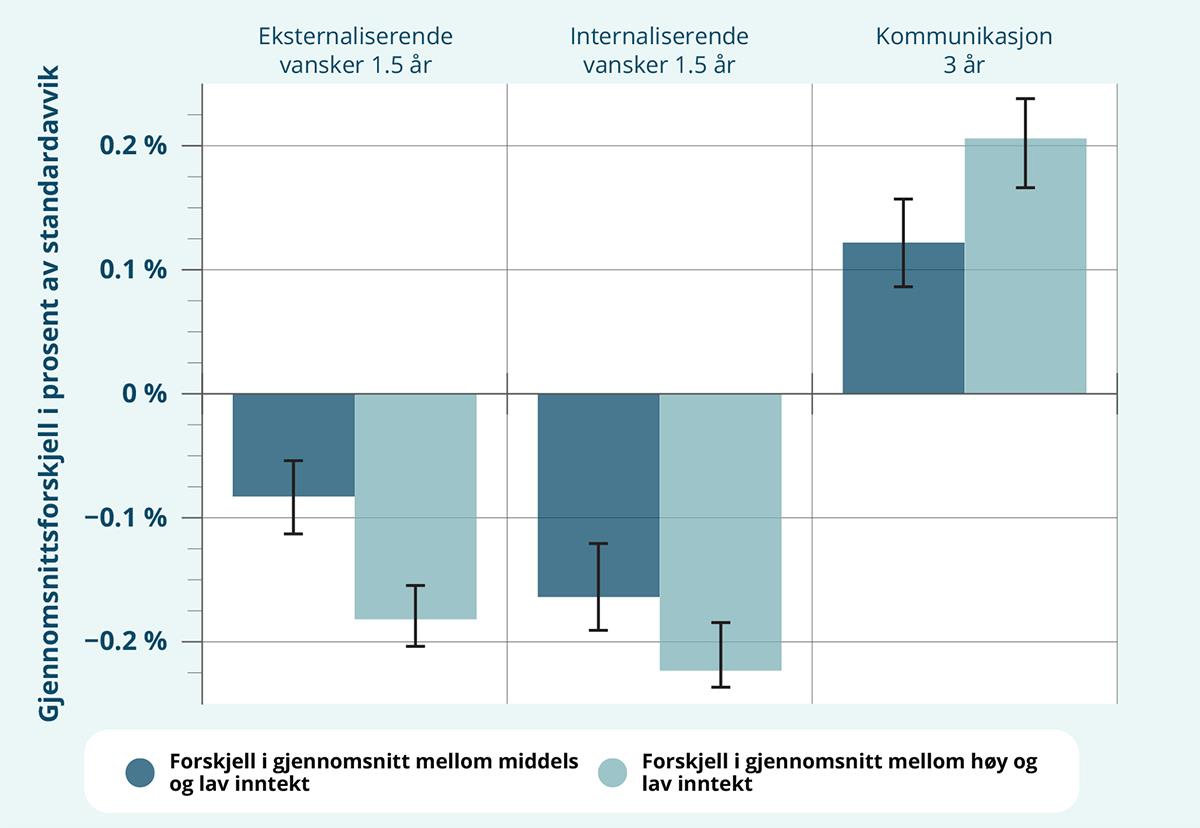 I MoBa kartlegges barnas internaliserende (tilbaketrekkende) og eksternaliserende (utagerende) adferdsvansker første gang når barna er 1.5 år. Internaliserende vansker kan for eksempel bety tristhet og engstelse, mens eksternaliserende vansker kan være sinne og utagering. I tillegg kartlegges kommunikasjonsferdigheter ved tre år. Tidlige adferdsvansker og kommunikasjonsferdigheter har en sammenheng med senere sosial og faglig utvikling på skolen. Som vist i figur 3.36 er det betydelige sosiale forskjeller allerede i tidlig utvikling. Barn i familier med lav inntekt skårer i gjennomsnitt rundt 20 prosent av et standardavvik dårligere sammenlignet med barn i familier med høy inntekt.