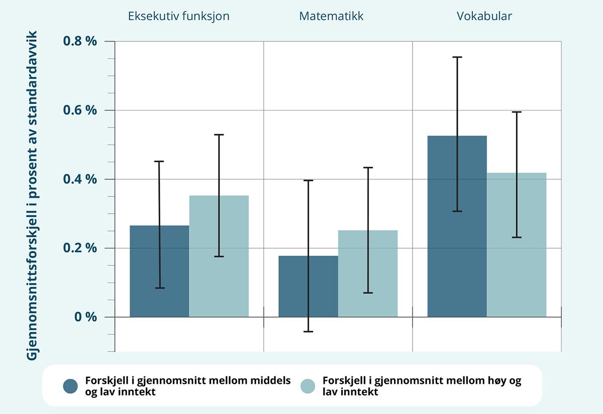 Note: Gjennomsnittsforskjeller mellom 5-åringer i familier med lav og middels inntekt, og mellom 5-åringer i familier med lav og høy inntekt. Standardiserte forskjeller i prosent av et standardavvik, der 1 standardavvik er et mål på «typisk» variasjon. Begrepet eksekutive funksjoner er forklart i definisjonslisten lengre bak i rapporten. Lav inntekt betyr at familien er i den nederste tredelen av inntektsfordelingen, høy inntekt er familier i den høyeste tredelen og middels inntekt er tredelen i midten.