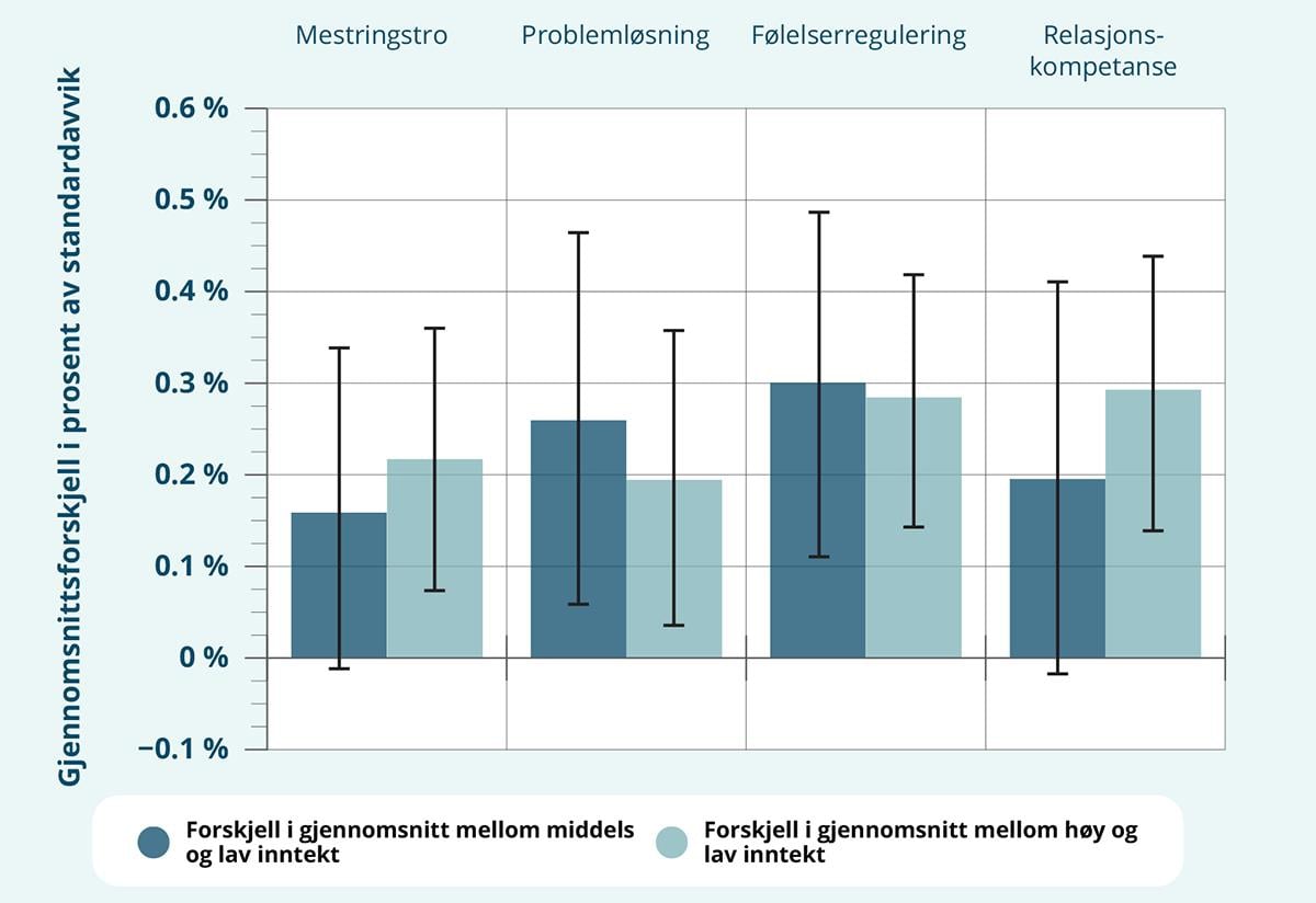 Note: Gjennomsnittsforskjeller mellom 8.klassinger i familier med lav og middels inntekt, og mellom 8.klassinger i familier med lav og høy inntekt. Sosiale og emosjonelle ferdigheter målt ved selvrapportering. Standardiserte forskjeller i prosent av et standardavvik, der 1 standardavvik er et mål på «typisk» variasjon. Lav inntekt betyr at familien er i den nederste tredelen av inntektsfordelingen, høy inntekt er familier i den høyeste tredelen og middels inntekt er tredelen i midten.