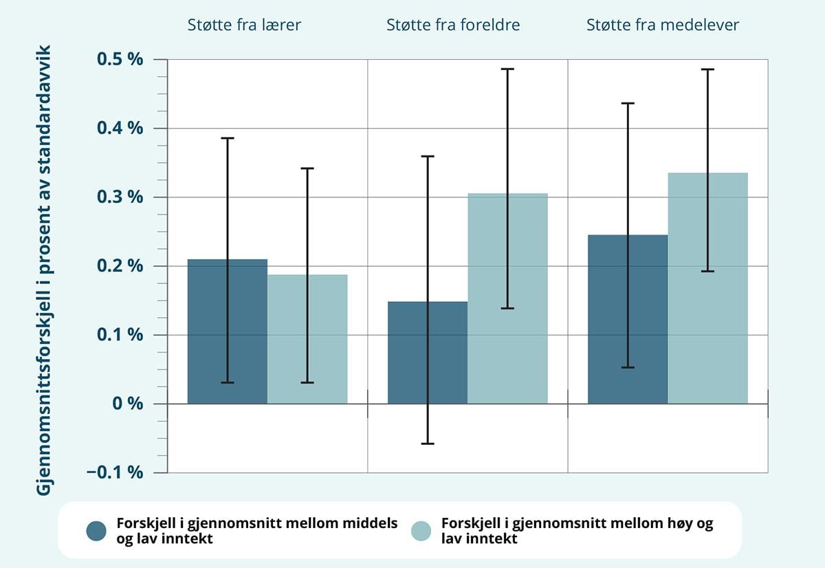 Note: Gjennomsnittsforskjeller i opplevd støtte mellom 8.klassinger i familier med lav og middels inntekt, og mellom 8.klassinger i familier med lav og høy inntekt. Standardiserte forskjeller i prosent av et standardavvik, der 1 standardavvik er et mål på «typisk» variasjon. Lav inntekt betyr at familien er i den nederste tredelen av inntektsfordelingen, høy inntekt er familier i den høyeste tredelen og middels inntekt er tredelen i midten