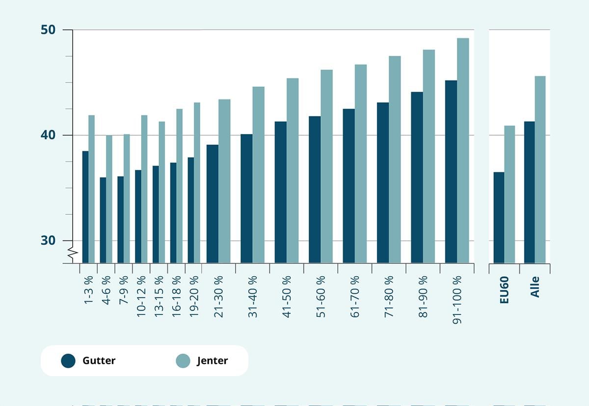 Note: Grunnskolepoeng for barn som fullførte grunnskolen i 2022, etter kjønn og husholdningens inntekt i 2021. Desil- og persentilinndelinger basert på inntekt per forbruksenhet for privathusholdninger. Se boks 3.1. Inntekt justert for antall forbruksenheter i husholdninger (EU-skala). Lavinntekt definert som husholdninger med inntekt under 60 prosent av median (per forbruksenhet). Studenthusholdninger og aleneboende barn under 18 år er inkludert.